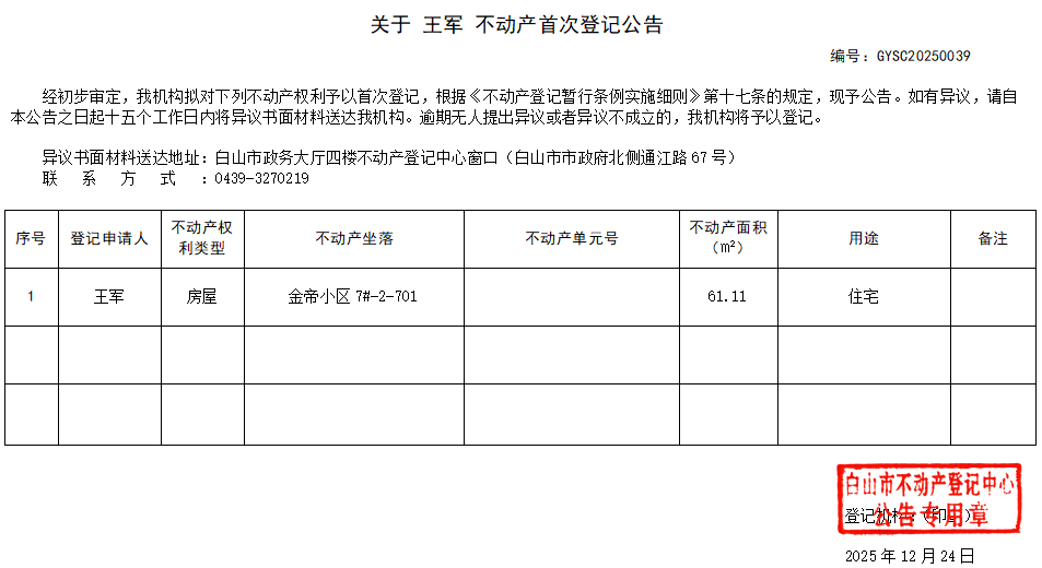 发布时间:2025-12-24 信息来源:白山市不动产登记中心 收藏