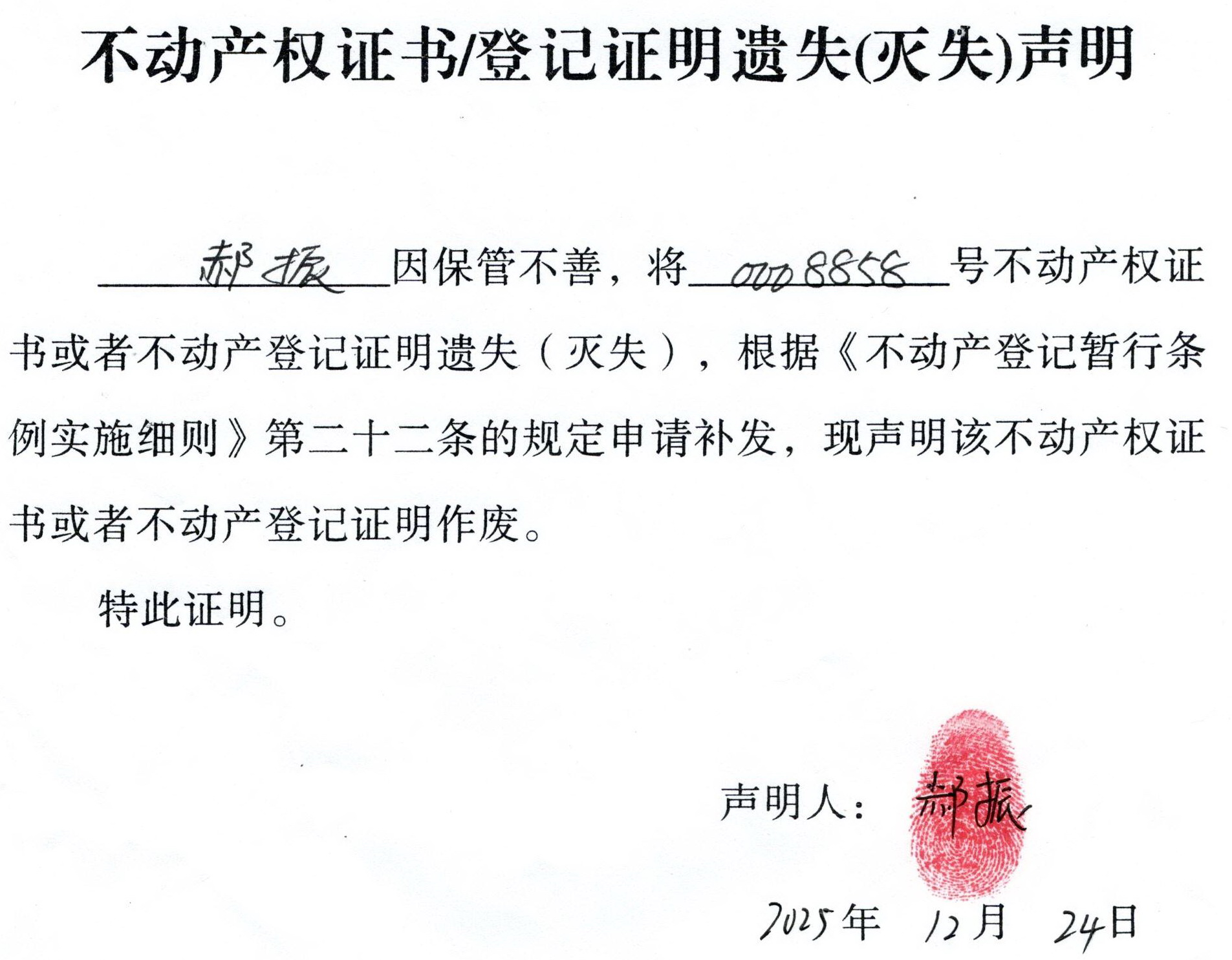 关于 郝振 不动产权证书/登记证明 遗失(灭失)声明