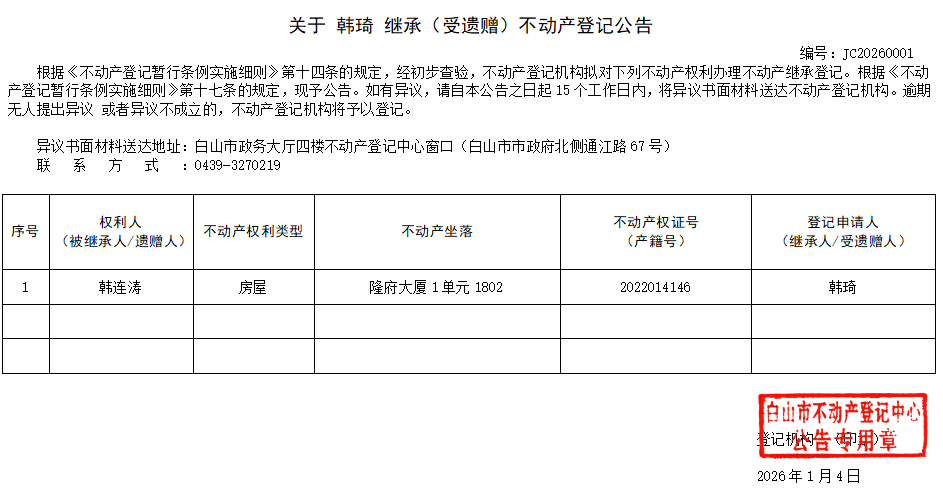 发布时间:2026-01-04 信息来源:白山市不动产登记中心 收藏