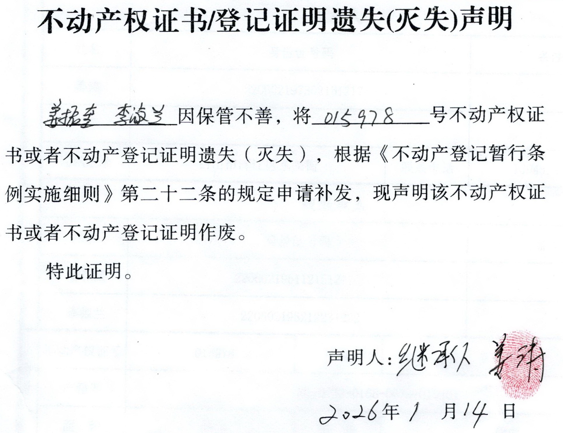 关于 姜振奎、李淑兰 不动产权证书/登记证明 遗失(灭失)声明