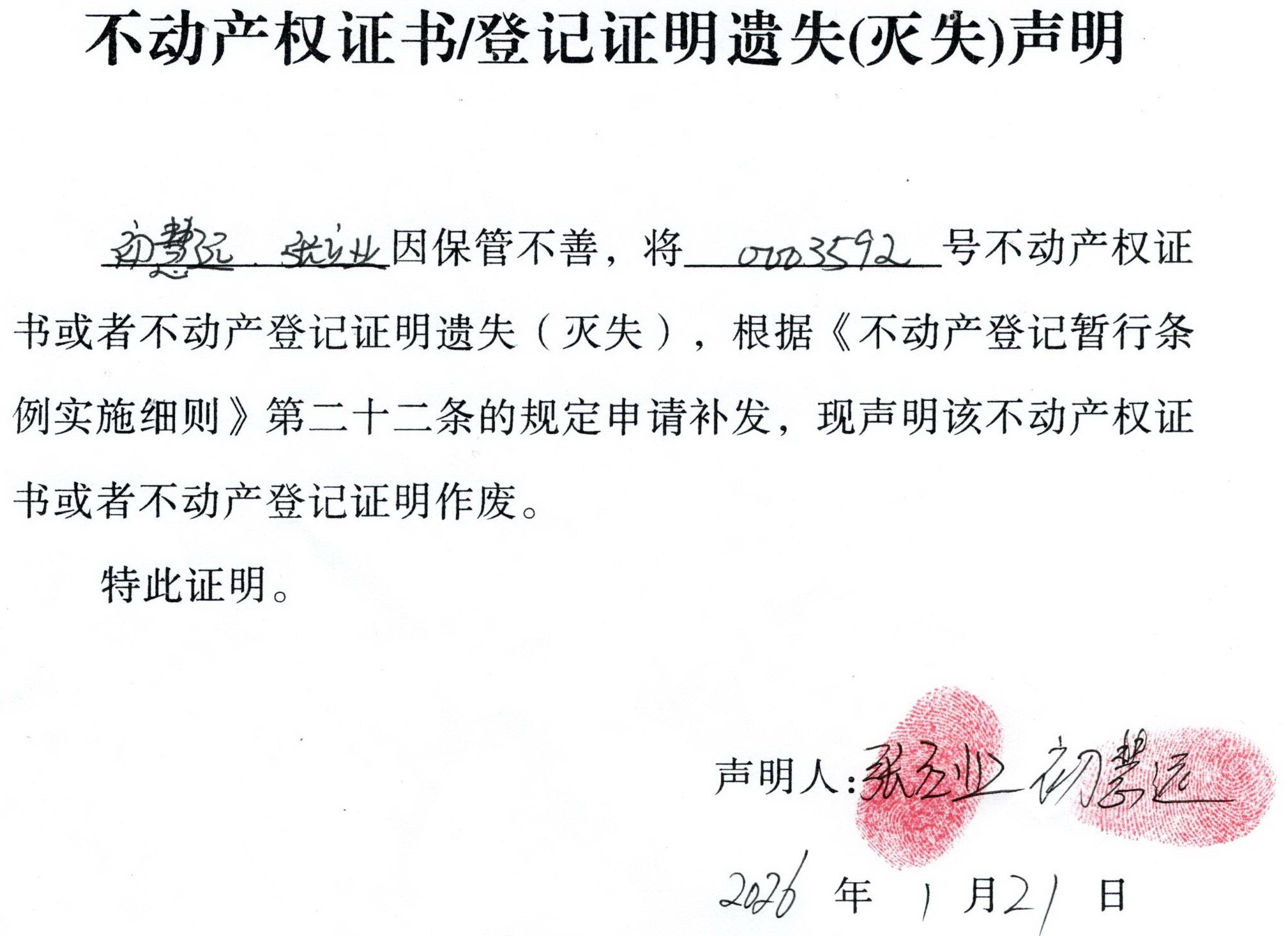 关于 初慧远、张立业 不动产权证书/登记证明 遗失(灭失)声明