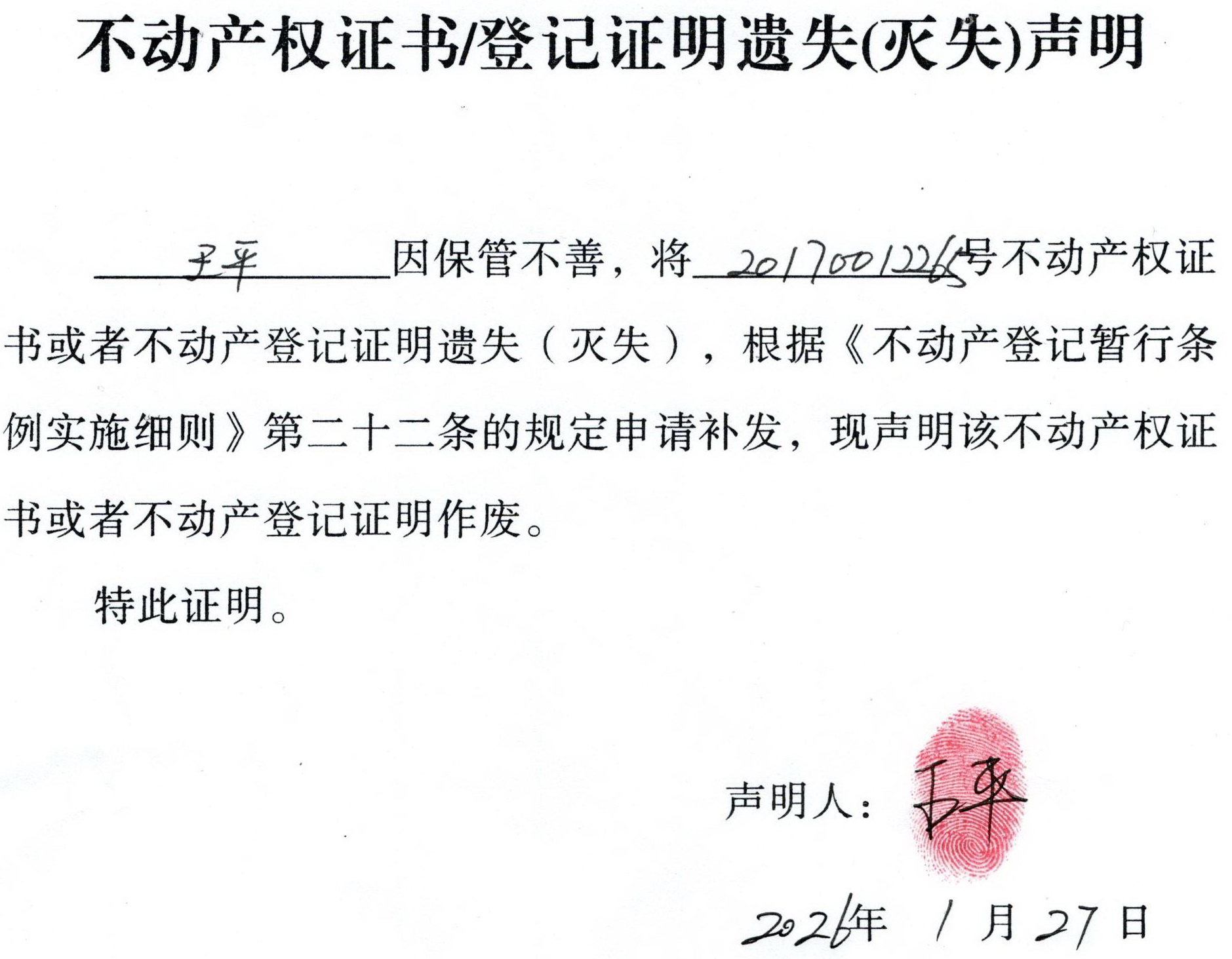 关于 王平 不动产权证书/登记证明 遗失(灭失)声明