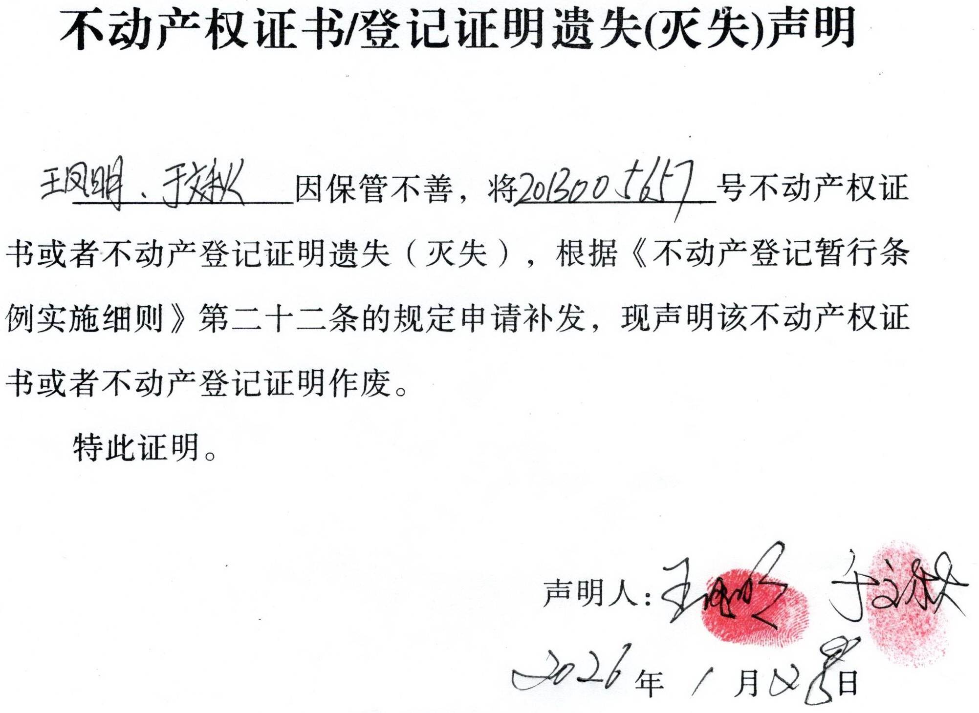 关于 王凤明、于文秋 不动产权证书/登记证明 遗失(灭失)声明
