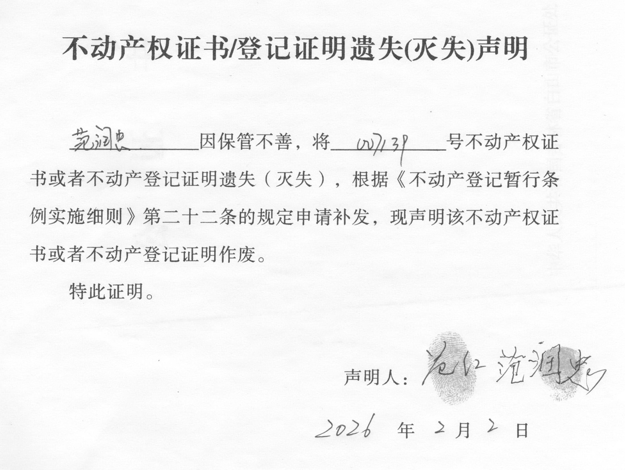 关于 范润忠 不动产权证书/登记证明 遗失(灭失)声明