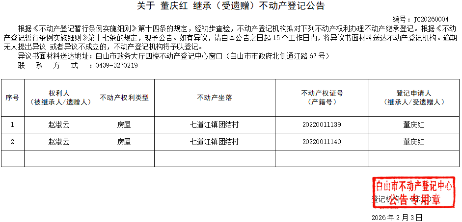 关于 董庆红 继承(受遗赠)不动产登记公告