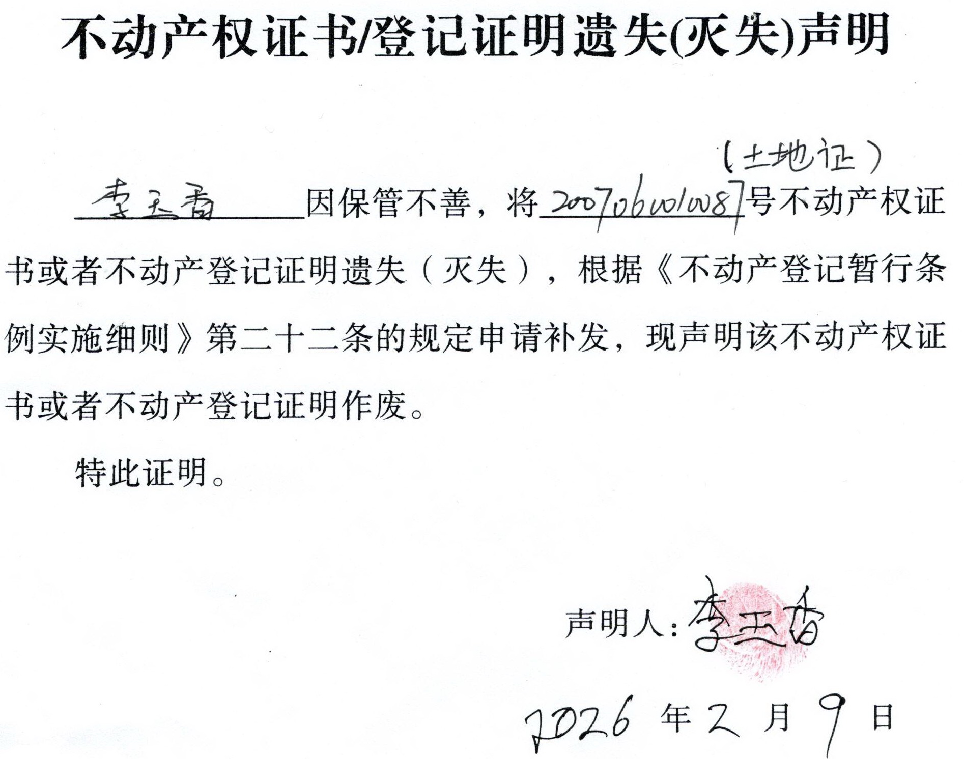 关于 李玉香 不动产权证书/登记证明 遗失(灭失)声明