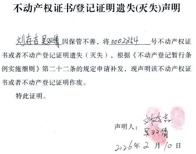 关于 刘存吉、吴双倩 不动产权证书/登记证明 遗失(灭失)声明