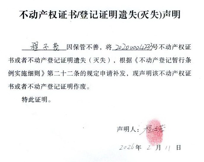 关于 程子茂 不动产权证书/登记证明 遗失(灭失)声明