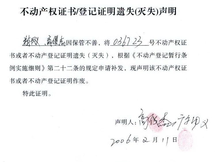 关于 游凤义 高俊杰 不动产权证书/登记证明 遗失(灭失)声明