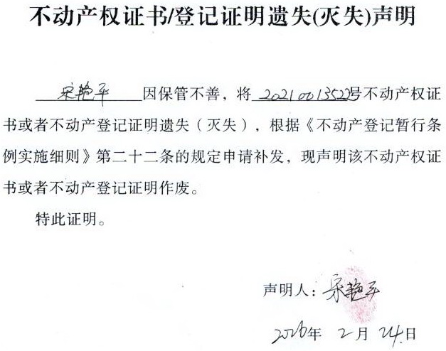 关于 宋艳平 不动产权证书/登记证明 遗失(灭失)声明