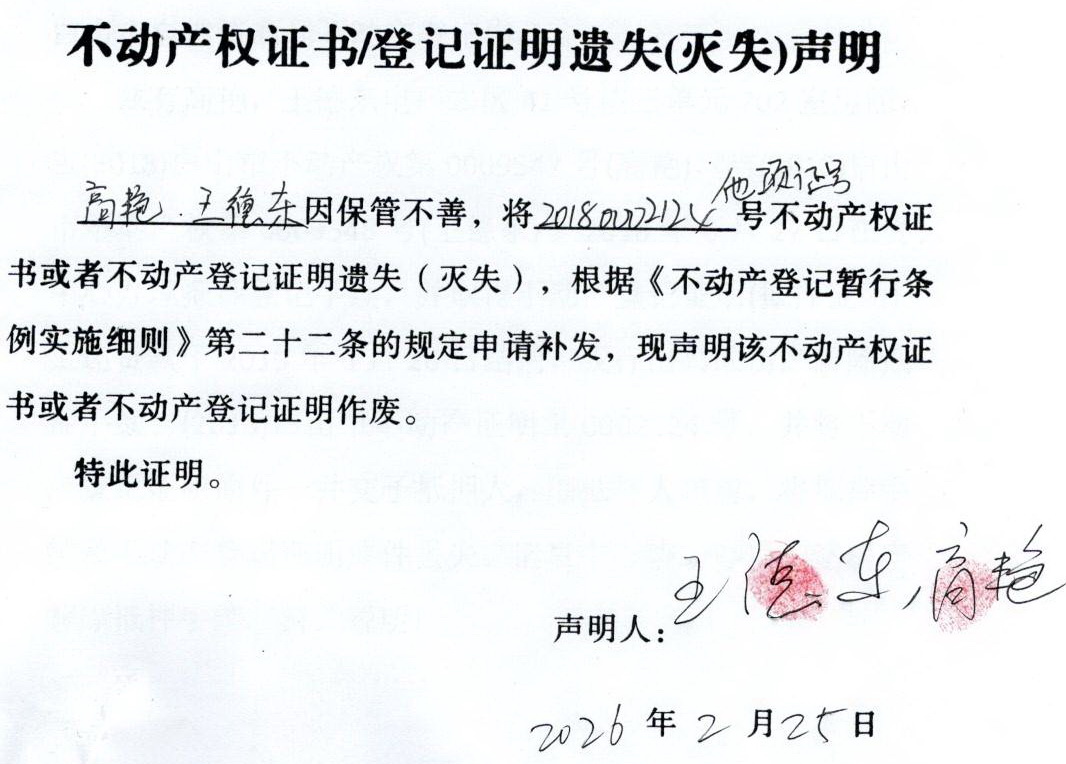关于 高艳、王德东 不动产权证书/登记证明 遗失(灭失)声明