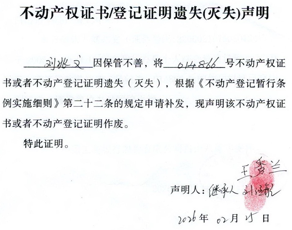 关于 刘兆文 不动产权证书/登记证明 遗失(灭失)声明