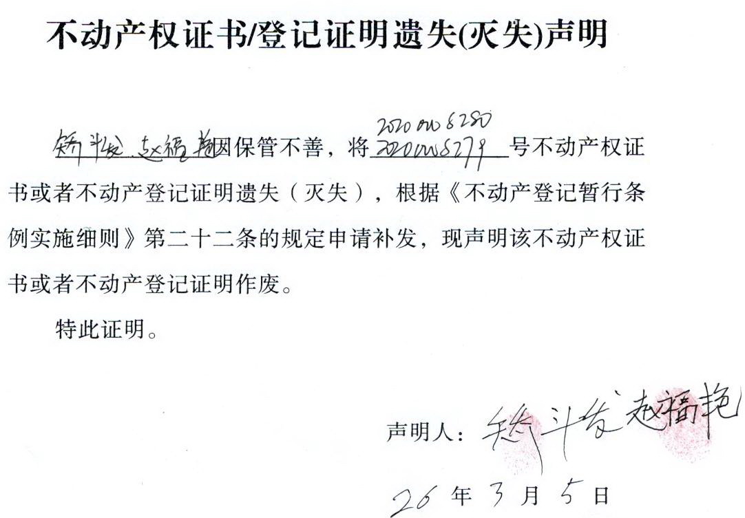 关于 矫斗发、赵福艳 不动产权证书/登记证明 遗失(灭失)声明
