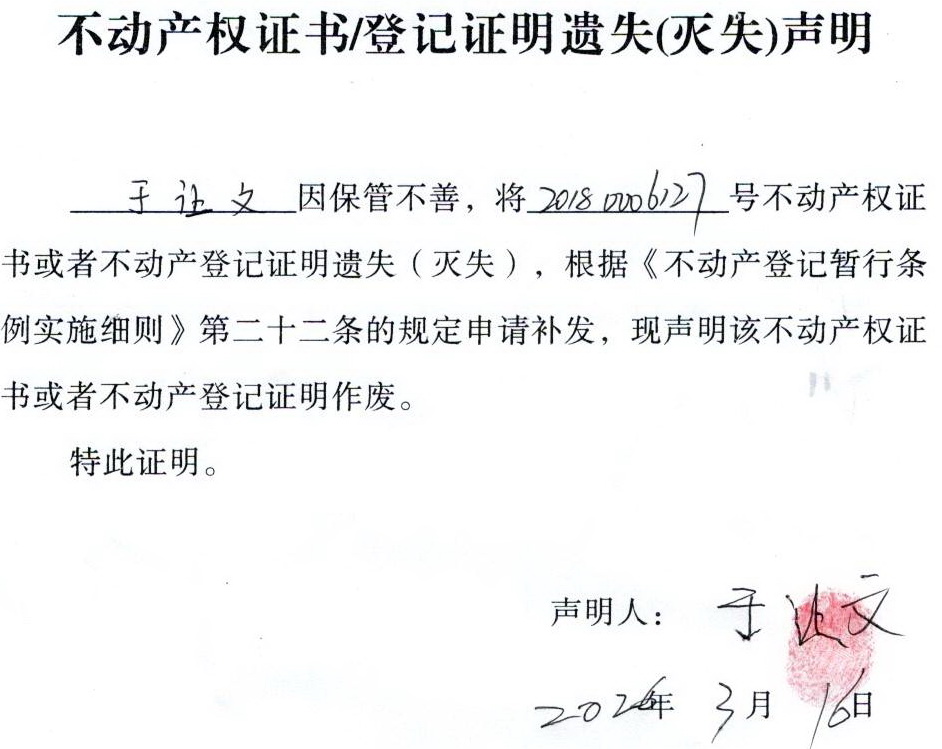 关于 于让文 不动产权证书/登记证明 遗失(灭失)声明
