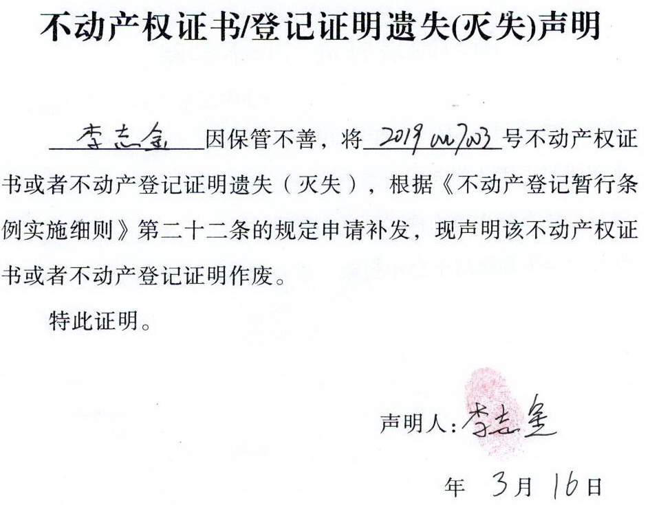 关于 李志金 不动产权证书/登记证明 遗失(灭失)声明