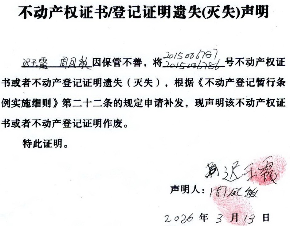 关于 迟玉霞,周凤敏 不动产权证书/登记证明 遗失(灭失)声明