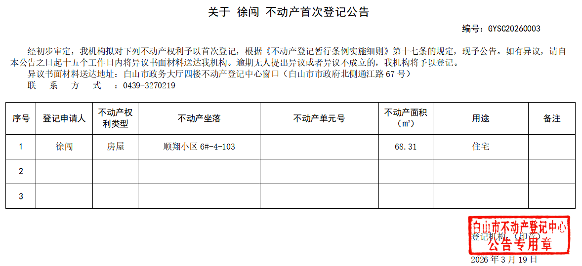 发布时间:2026-03-19 信息来源:白山市不动产登记中心 收藏