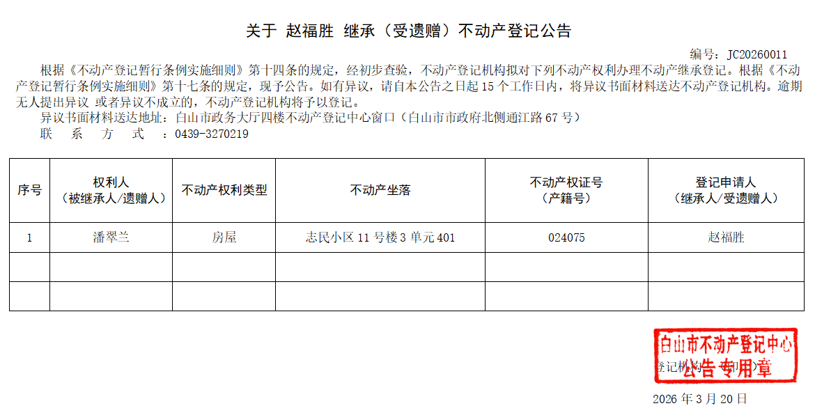 发布时间:2026-03-20 信息来源:白山市不动产登记中心 收藏