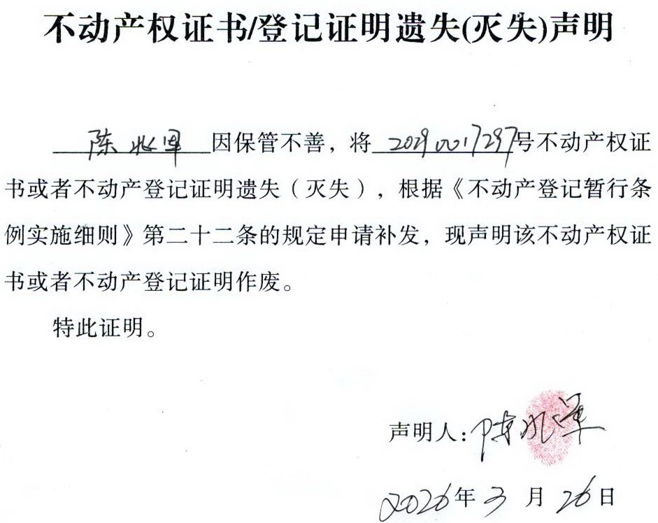 关于 陈兆军 不动产权证书/登记证明 遗失(灭失)声明