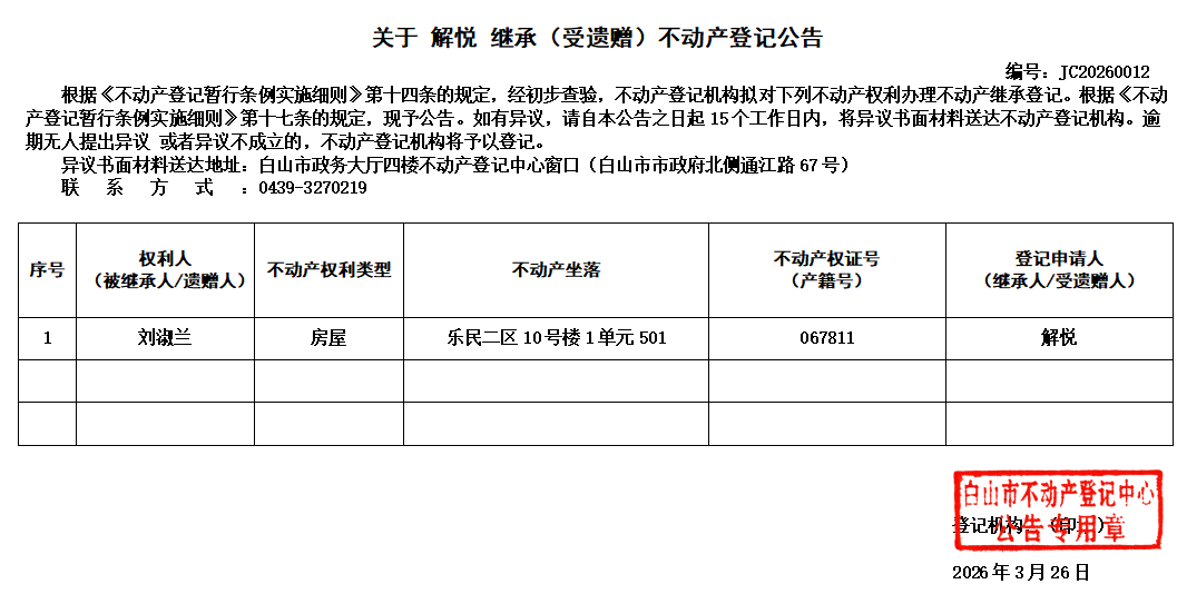 发布时间:2026-03-26 信息来源:白山市不动产登记中心 收藏