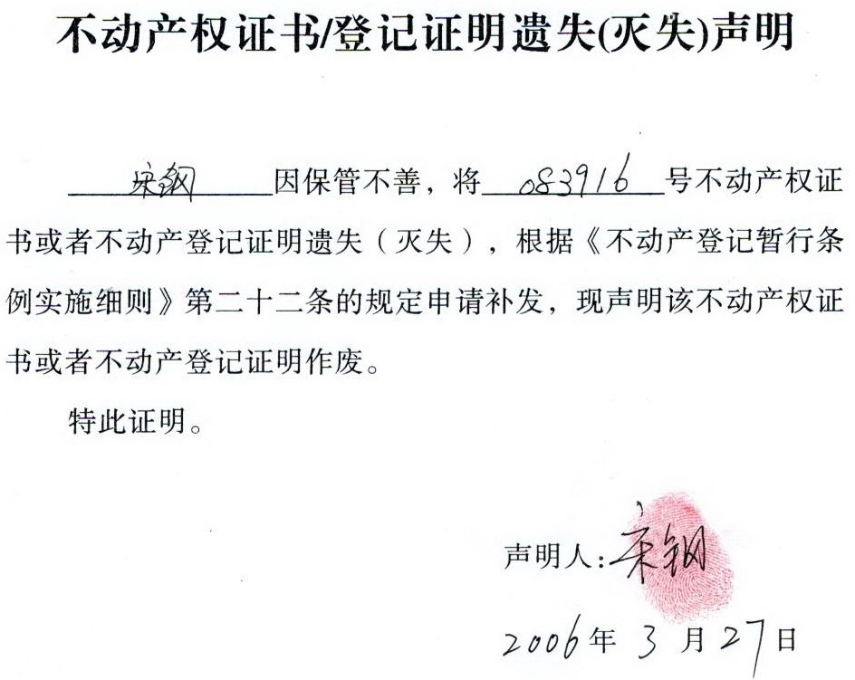 关于 宋钢 不动产权证书/登记证明 遗失(灭失)声明
