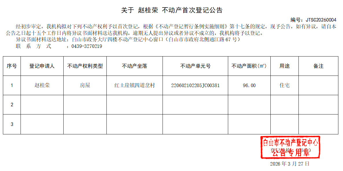 发布时间:2026-03-27 信息来源:白山市不动产登记中心 收藏