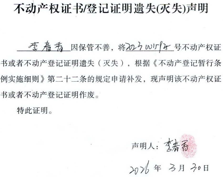 关于 李春香 不动产权证书/登记证明 遗失(灭失)声明