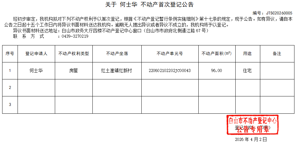 发布时间:2026-04-02 信息来源:白山市不动产登记中心 收藏
