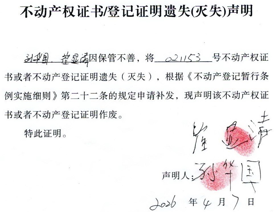 关于 孙华国、崔显清 不动产权证书/登记证明 遗失(灭失)声明