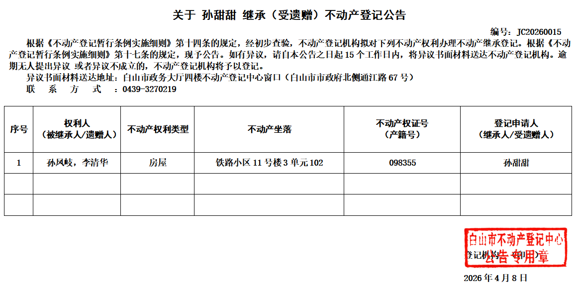 发布时间:2026-04-08 信息来源:白山市不动产登记中心 收藏