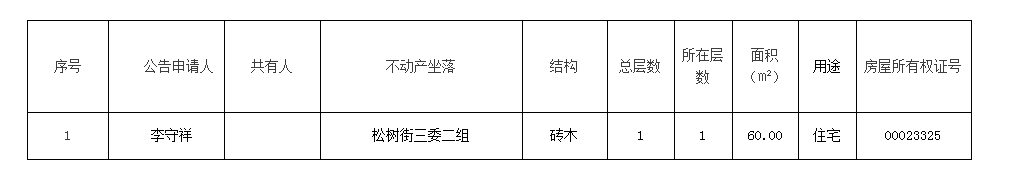 经初步审定,我机构拟对下列不动产权力予以丢失补证公告,根据《不动产登记暂行条例实施细则》第十七条、二十二条 的规定,现予以公告。如有异议,请自本公告之日起1个工作日内将异议书面材料送达我机构。逾期无人提出异议或者异议不成立的,我机构将作废原房屋所有权证,予以申请人办理不动产权力丢失补证登记。