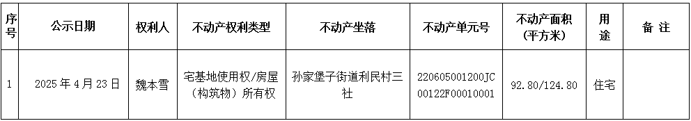 经初步审定,我机构拟对下列不动产权力予以首次登记,根据《不动产登记暂行条例实施细则》第十七条的规定,现予公告。如有异议,请自本公告之日起1个工作日内将异议书面材料送达我机构。逾期无人提出异议或者异议不成立的,我机构将予以登记。