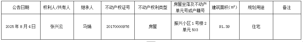 以下住房为权利人(共有人)所有财产,因权利人或共有人死亡,该不动产由继承人继承。继承人于公告之日提供了不动产权属所需继承相关材料并签署了继承协议书,申请以下不动产继承登记。现根据《物权法》、《不动产登记暂行条例实施细则》和《不动产登记操作规范(试行)》之规定,对该申请进行审查并予公告。