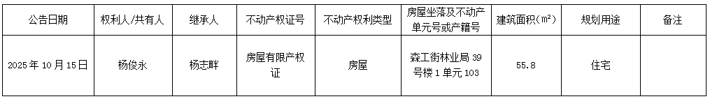 以下住房为权利人(共有人)所有财产,因权利人或共有人死亡,该不动产由继承人继承。继承人于公告之日提供了不动产权属所需继承相关材料并签署了继承协议书,申请以下不动产继承登记。现根据《物权法》、《不动产登记暂行条例实施细则》和《不动产登记操作规范(试行)》之规定,对该申请进行审查并予公告。