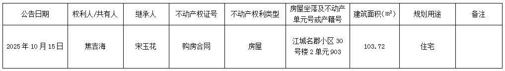 以下住房为权利人(共有人)所有财产,因权利人或共有人死亡,该不动产由继承人继承。继承人于公告之日提供了不动产权属所需继承相关材料并签署了继承协议书,申请以下不动产继承登记。现根据《物权法》、《不动产登记暂行条例实施细则》和《不动产登记操作规范(试行)》之规定,对该申请进行审查并予公告。
