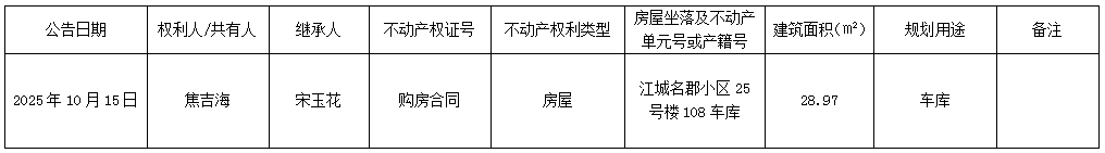 以下住房为权利人(共有人)所有财产,因权利人或共有人死亡,该不动产由继承人继承。继承人于公告之日提供了不动产权属所需继承相关材料并签署了继承协议书,申请以下不动产继承登记。现根据《物权法》、《不动产登记暂行条例实施细则》和《不动产登记操作规范(试行)》之规定,对该申请进行审查并予公告。