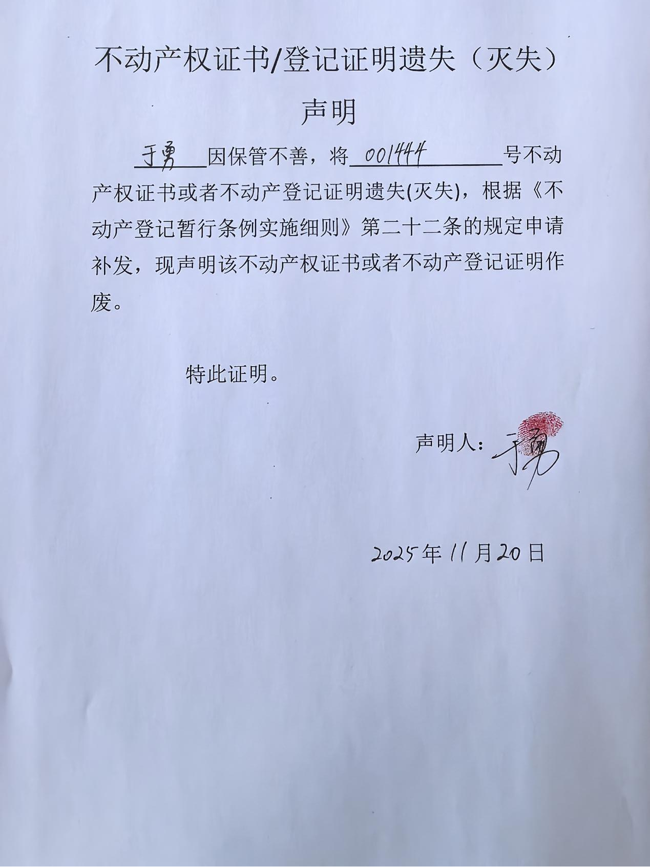 不动产权证丢失补证公告(于勇)