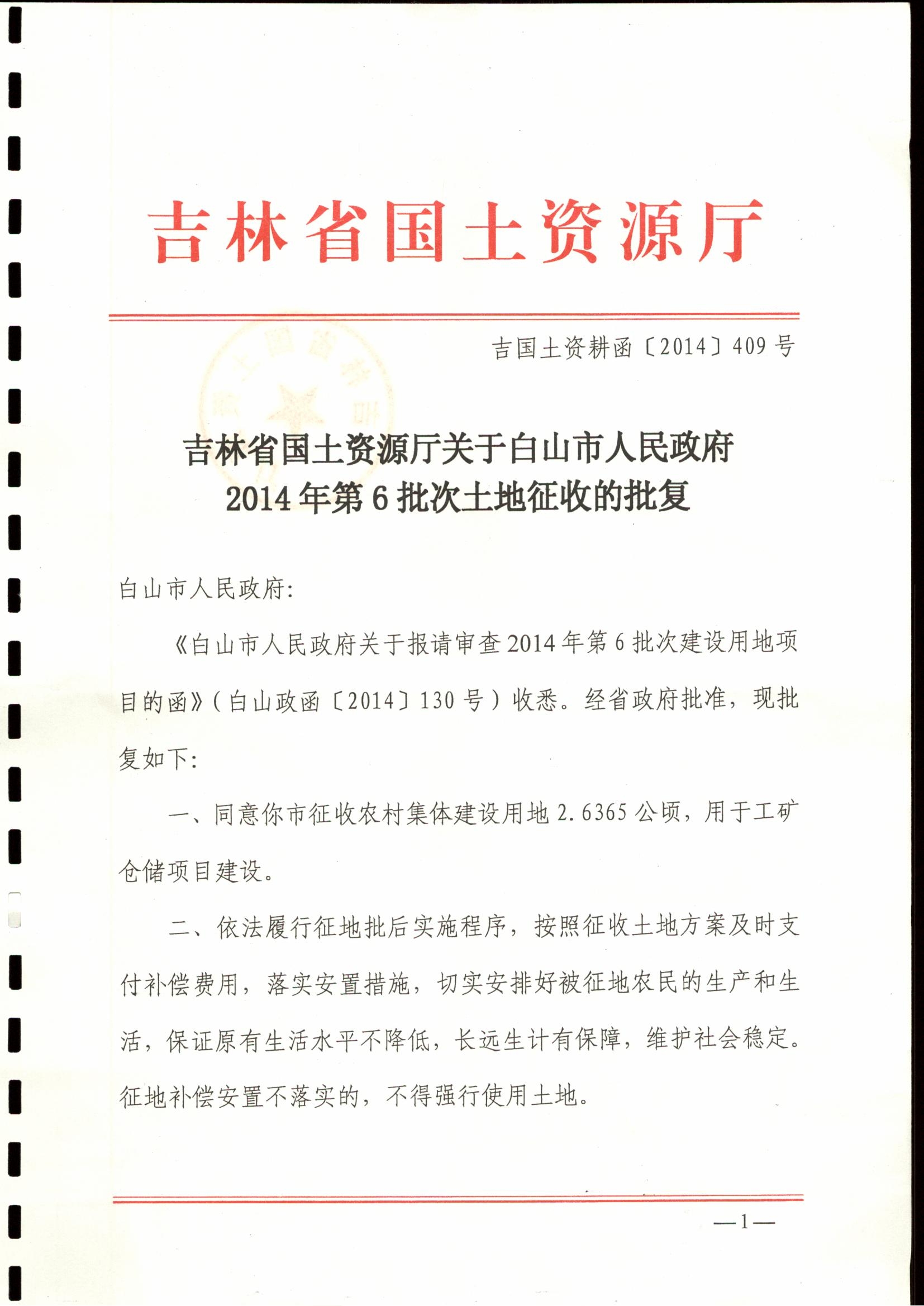 | ·吉林省国土资源厅关于白山市人民政府2014年第6批次农用地转用和土地征收的批复1.jpg | |