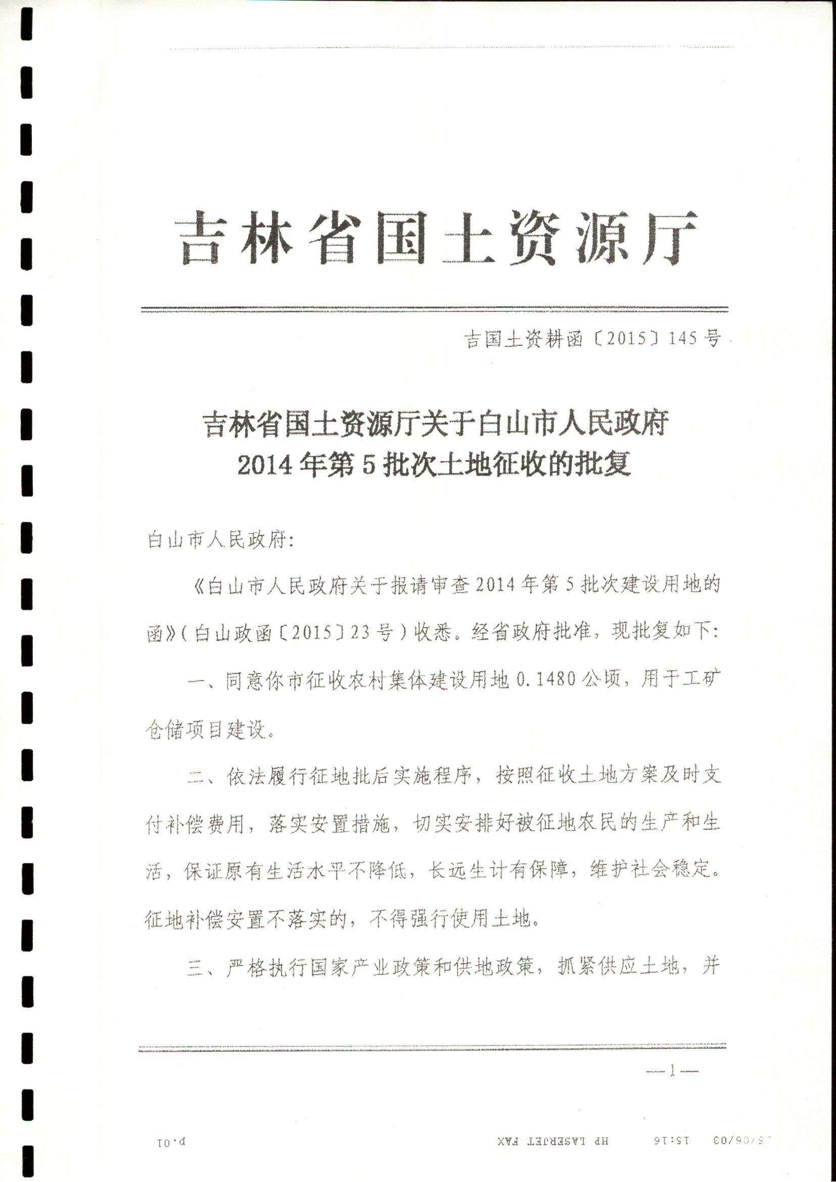 | ·吉林省国土资源厅关于白山市人民政府2014年第1批次农用地转用和土地征收的批复2.jpg | |