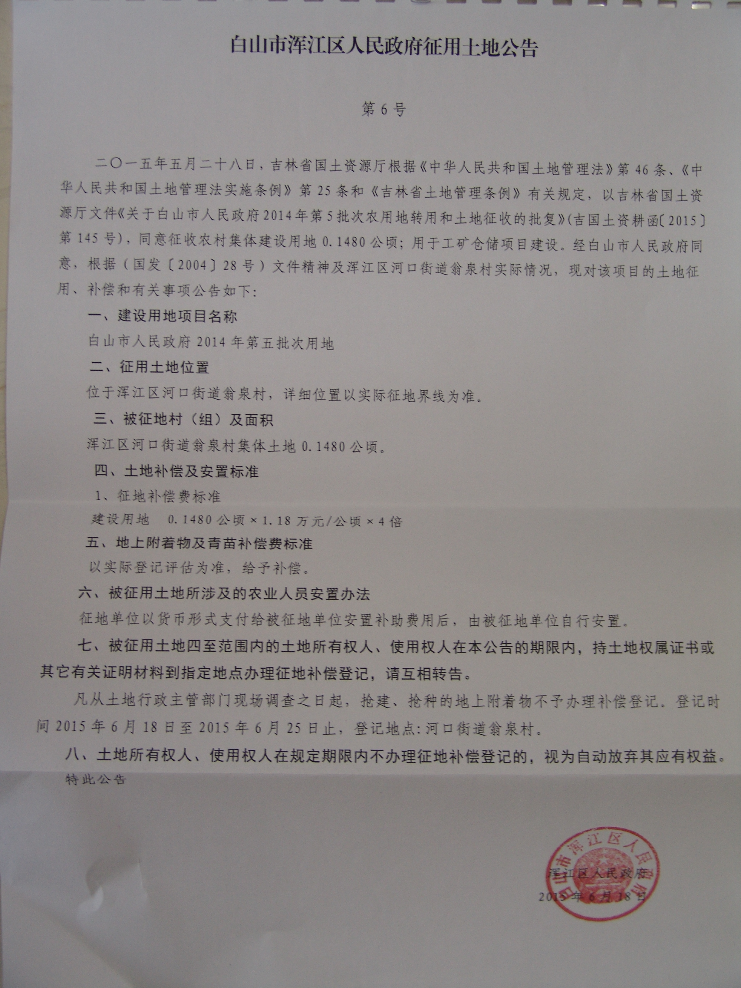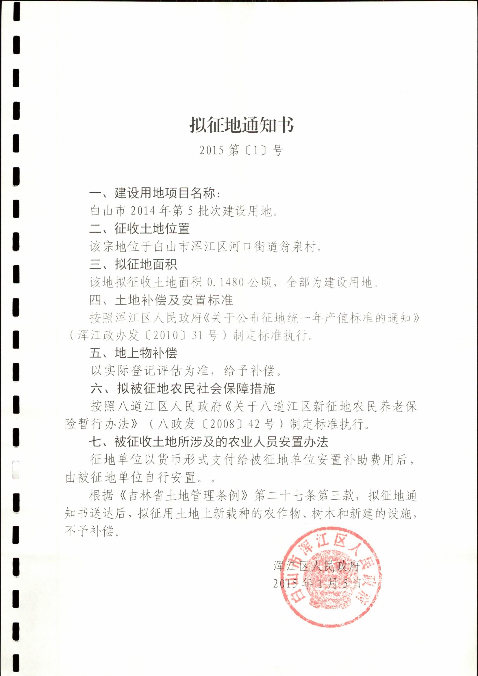根据《中华人民共和国土地管理法》第46条、《中华人民共和国土地管理法实施条例》第25条、《吉林省土地管理条例》的有关规定,省厅《关于白山市人民政府2014年第5批次农用地转用和土地征收的批复》,批准征收浑江区河口街道瓮泉村集体土地0.1480公顷。现将本次征地内容和有关事项通知如下: