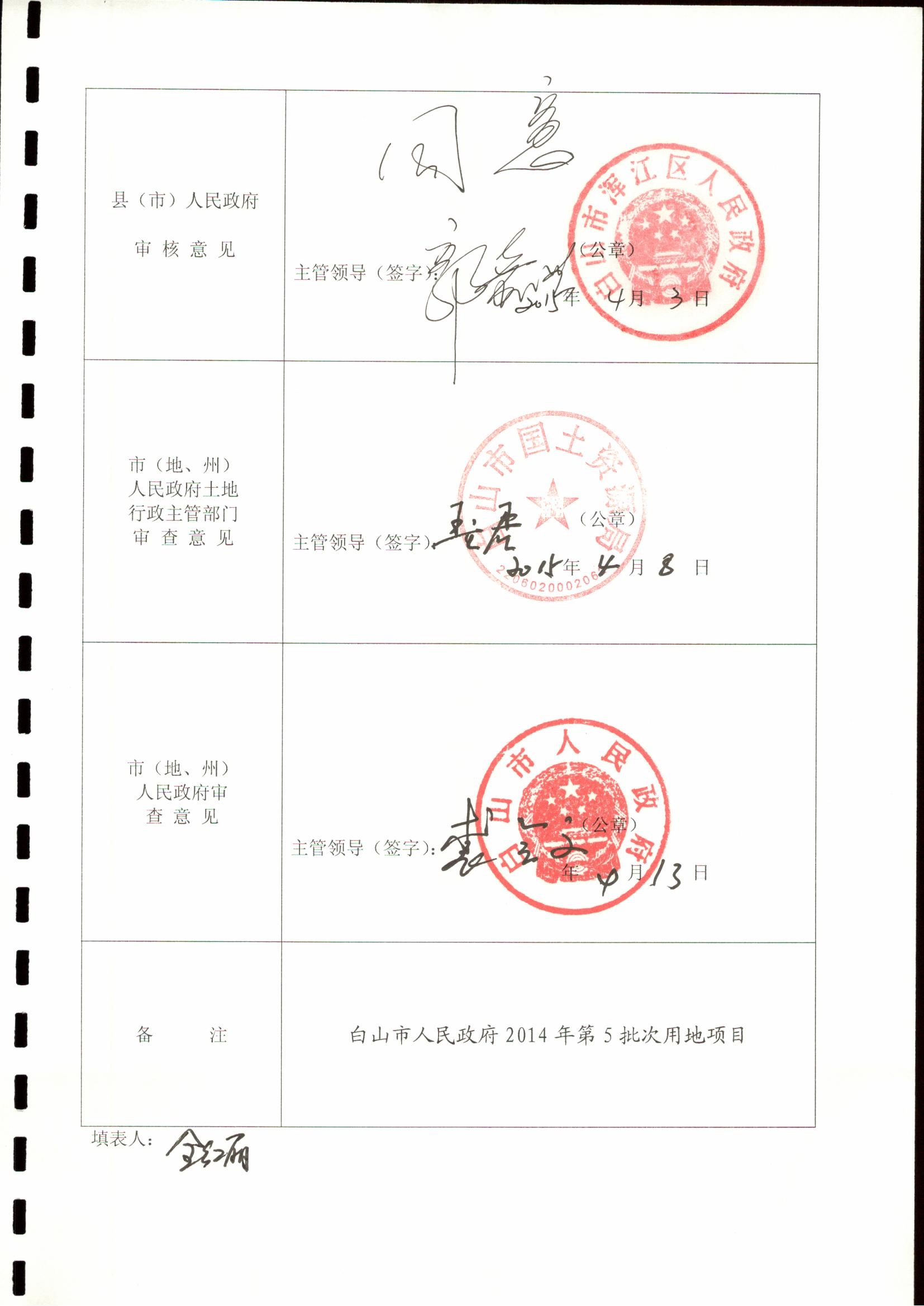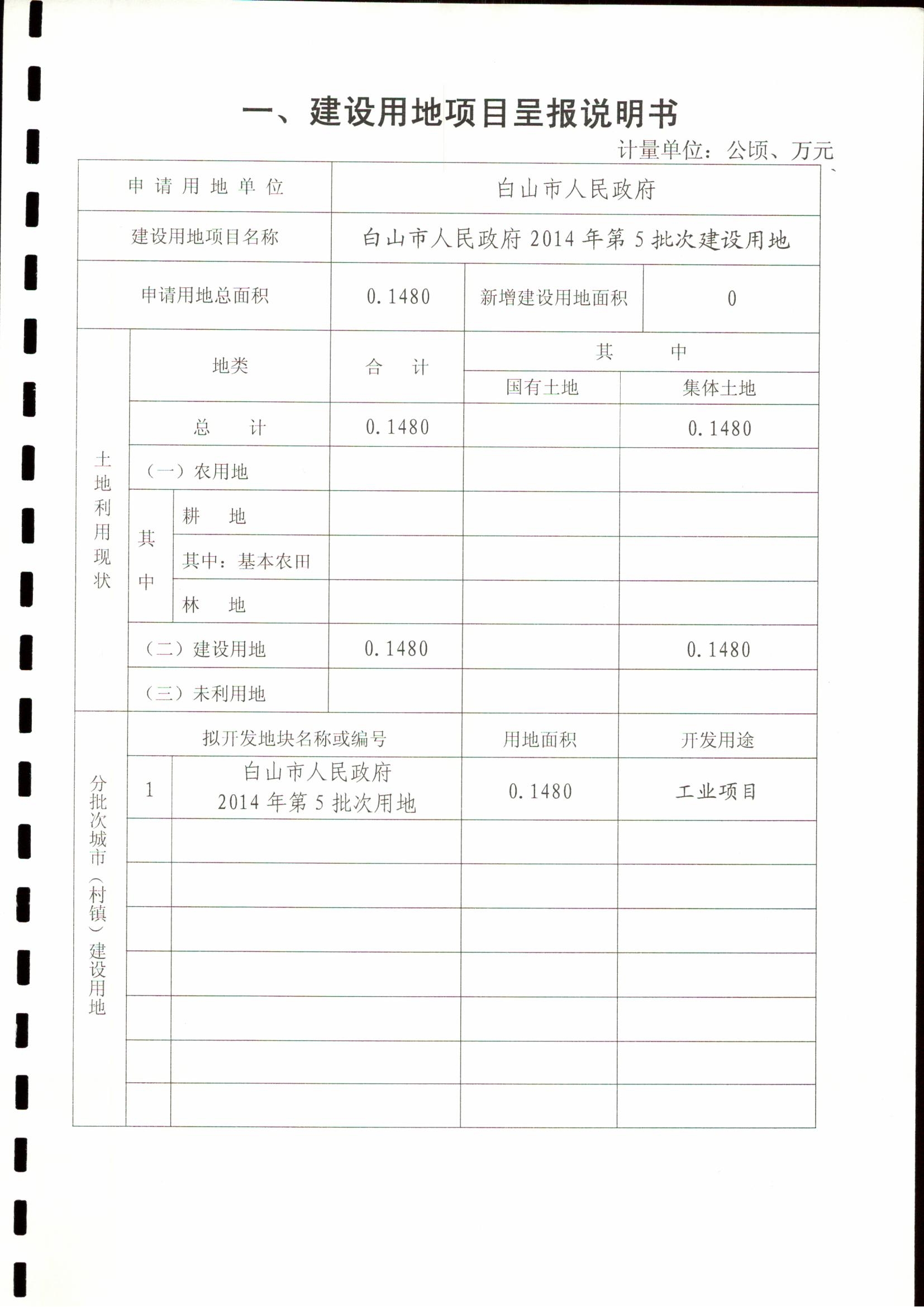 一、征用土地批准情况 白山市人民政府2014年第5批次