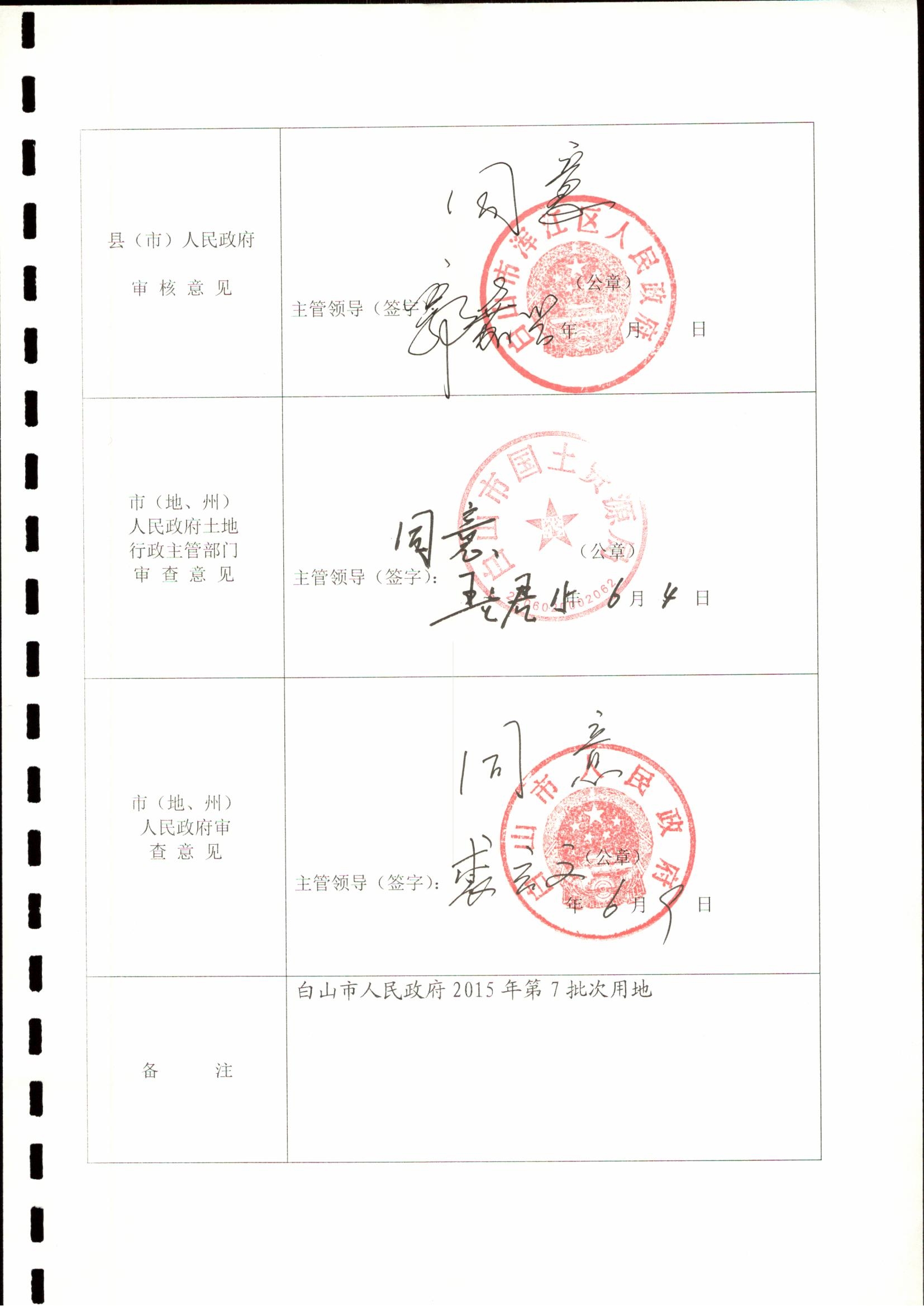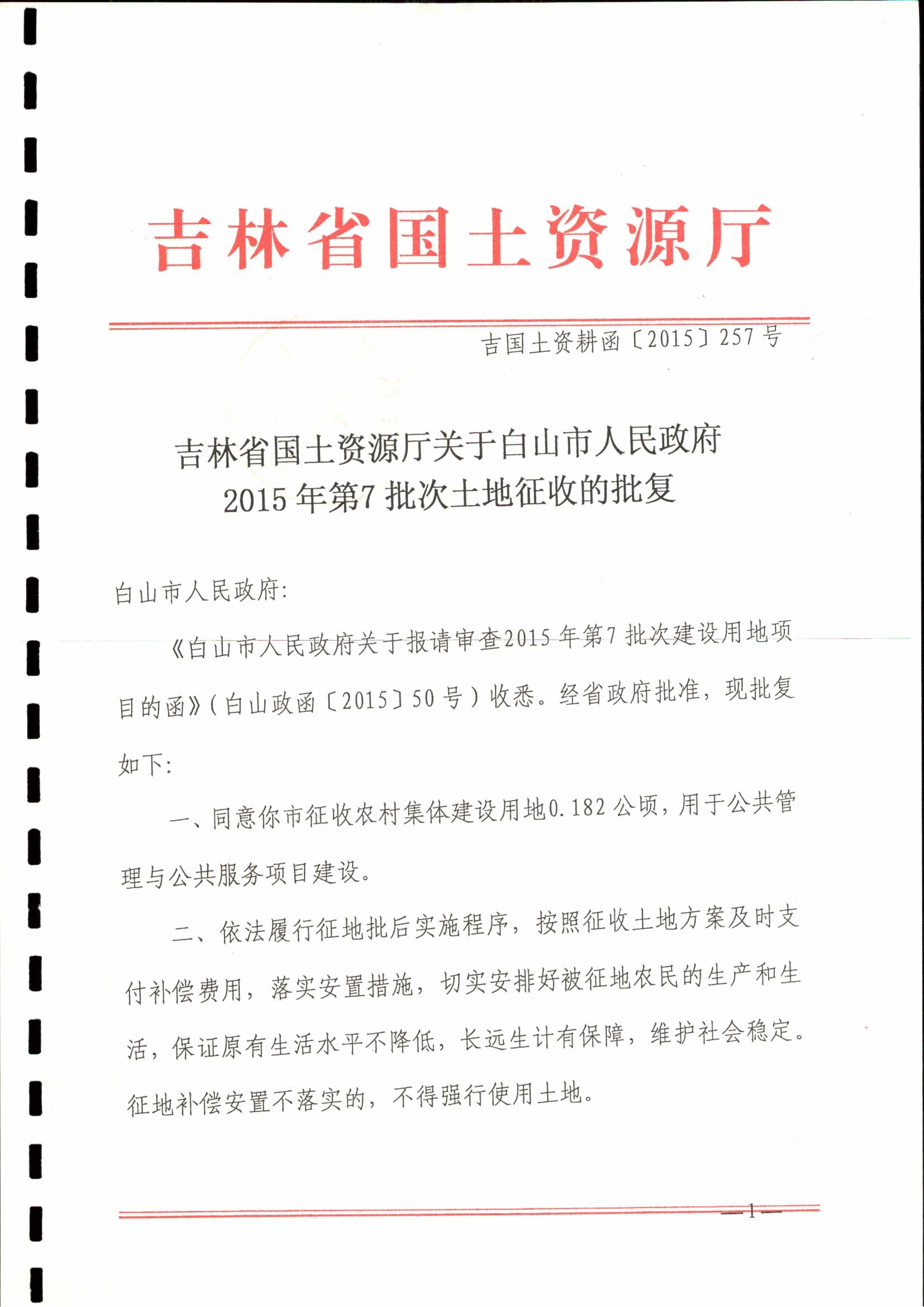 | ·吉林省国土资源厅关于白山市人民政府2015年第7批次农用地转用和土地征收的批复2.jpg | |