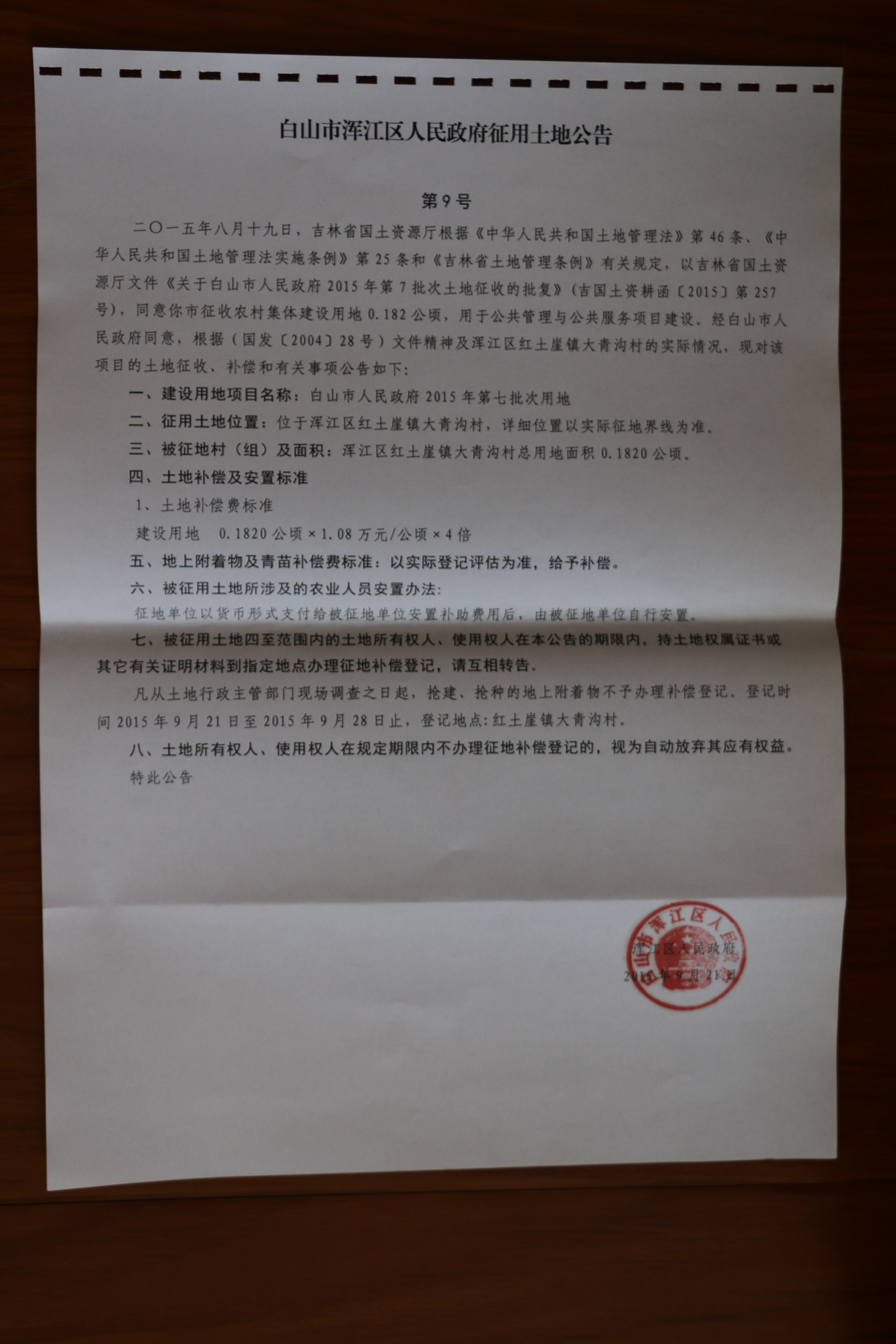 根据《中华人民共和国土地管理法》第46条、《中华人民共和国土地管理法实施条例》第25条、《吉林省土地管理条例》的有关规定,省厅《关于白山市人民政府2015年第7批次土地征收的批复》,批准征收浑江区红土崖镇大青沟村集体土地0.1820公顷。现将本次征地内容和有关事项通知如下: